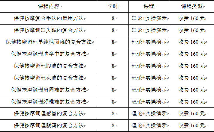 課程安排:保健按摩特色課程以中醫(yī)基礎(chǔ)為主,收費(fèi)1380元【共十天,課程詳情見上圖】,單項(xiàng)培訓(xùn)依據(jù)課程大綱價(jià)格而定,單項(xiàng)160元/節(jié),不可享受優(yōu)惠。參加培訓(xùn)學(xué)員食、宿、交通費(fèi)自理。