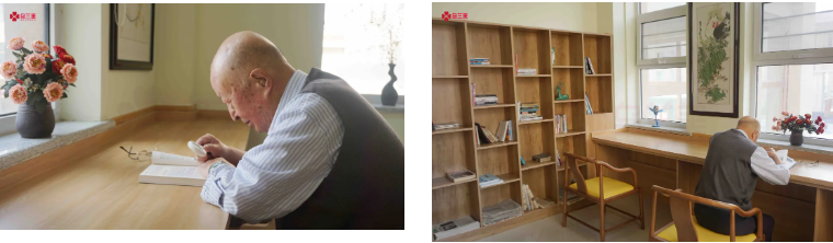 在烏蘭美康養(yǎng)院的圖書室里,人們常常會(huì)看到一位老人拿著放大鏡在埋頭讀書,一讀就是2小時(shí)。談及爺爺?shù)拈喿x愛好,老人家興奮地說:“我每天早上起來,在康養(yǎng)院內(nèi)散散步。九點(diǎn)左右就去康復(fù)訓(xùn)練室里用按摩椅活動(dòng)活動(dòng)筋骨,九點(diǎn)半左右我就去圖書室了,一般看兩小時(shí)的書。每天中午和晚上睡覺前,我是一定要看一小時(shí)書的,這已經(jīng)成為了生活‘必需品’。”不少人感嘆王爺爺?shù)淖月?,他卻打趣道:“我也是勞逸結(jié)合!午睡后,我會(huì)到活動(dòng)室打兩小時(shí)的麻將。”